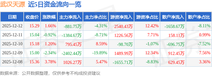 证券之星消息,截至2025年12月12日收盘,武汉天源(301127)报收于15.29元,上涨1.66%,换手率2.01%,成交量13.38万手,成交额2.05亿元。