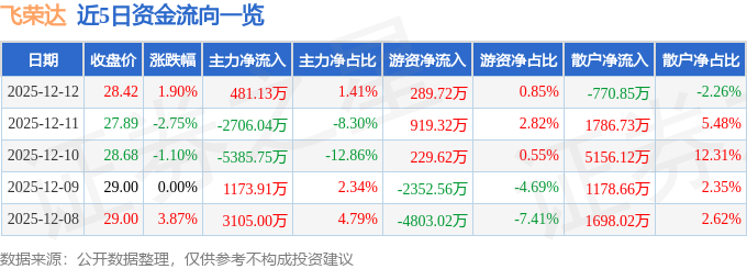 证券之星消息,截至2025年12月12日收盘,飞荣达(300602)报收于28.42元,上涨1.9%,换手率3.06%,成交量12.11万手,成交额3.41亿元。