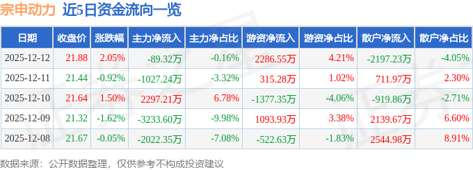 证券之星消息,截至2025年12月12日收盘,宗申动力(001696)报收于21.88元,上涨2.05%,换手率2.79%,成交量24.9万手,成交额5.43亿元。