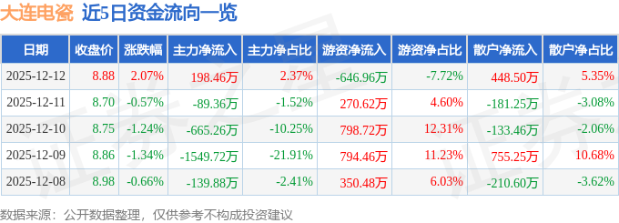12月12日的资金流向数据方面,主力资金净流入198.46万元,占总成交额2.37%,游资资金净流出646.96万元,占总成交额7.72%,散户资金净流入448.5万元,占总成交额5.35%。