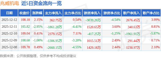 证券之星消息,截至2025年12月12日收盘,兆威机电(003021)报收于108.1元,上涨2.15%,换手率3.08%,成交量6.38万手,成交额6.7亿元。