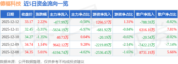 证券之星消息,截至2025年12月12日收盘,德福科技(301511)报收于33.17元,上涨2.22%,换手率7.89%,成交量29.54万手,成交额9.65亿元。