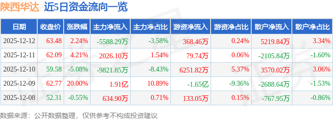 证券之星消息,截至2025年12月12日收盘,陕西华达(301517)报收于63.48元,上涨2.24%,换手率24.84%,成交量24.38万手,成交额15.62亿元。