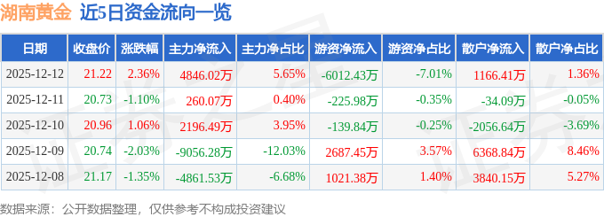 证券之星消息,截至2025年12月12日收盘,湖南黄金(002155)报收于21.22元,上涨2.36%,换手率2.6%,成交量40.65万手,成交额8.58亿元。