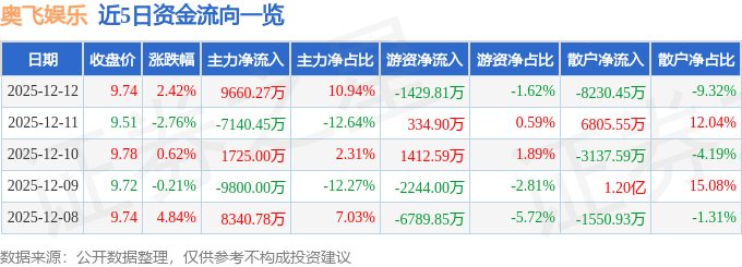 证券之星消息,截至2025年12月12日收盘,奥飞娱乐(002292)报收于9.74元,上涨2.42%,换手率8.84%,成交量89.93万手,成交额8.83亿元。