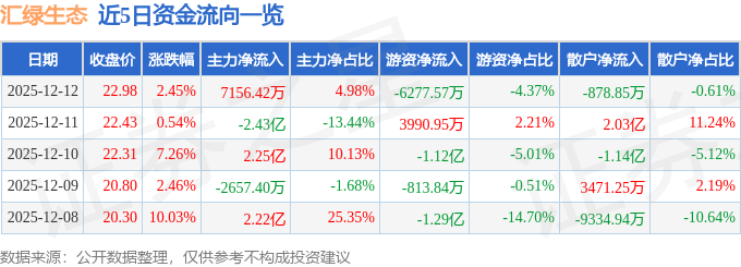 证券之星消息,截至2025年12月12日收盘,汇绿生态(001267)报收于22.98元,上涨2.45%,换手率10.33%,成交量62.6万手,成交额14.37亿元。