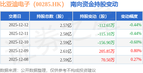 证券之星消息,12月12日南向资金减持112.65万股比亚迪电子(00285.HK)。近5个交易日中,获南向资金减持的有3天,累计净减持108.3万股。近20个交易日中,获南向资金减持的有11天,累计净减持190.07万股。截至目前,南向资金持有比亚迪电子(00285.HK)2.57亿股,占公司已发行普通股的11.4%。