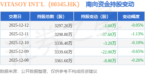 证券之星消息,12月12日南向资金减持1.6万股VITASOY INT'L(00345.HK)。近5个交易日中,获南向资金减持的有5天,累计净减持73.2万股。近20个交易日中,获南向资金增持的有14天,累计净增持152.2万股。截至目前,南向资金持有VITASOY INT'L(00345.HK)3297.2万股,占公司已发行普通股的3.15%。