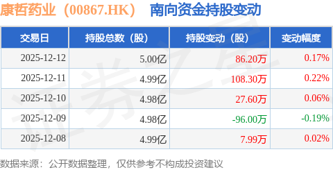 证券之星消息,12月12日南向资金增持86.2万股康哲药业(00867.HK)。近5个交易日中,获南向资金增持的有4天,累计净增持134.09万股。近20个交易日中,获南向资金增持的有13天,累计净增持441.7万股。截至目前,南向资金持有康哲药业(00867.HK)5.0亿股,占公司已发行普通股的20.49%。