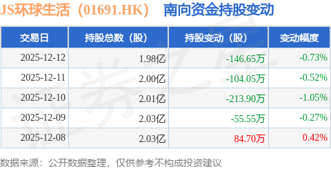 证券之星消息,12月12日南向资金减持146.65万股JS环球生活(01691.HK)。近5个交易日中,获南向资金减持的有4天,累计净减持435.45万股。近20个交易日中,获南向资金减持的有16天,累计净减持1705.8万股。截至目前,南向资金持有JS环球生活(01691.HK)1.98亿股,占公司已发行普通股的5.69%。