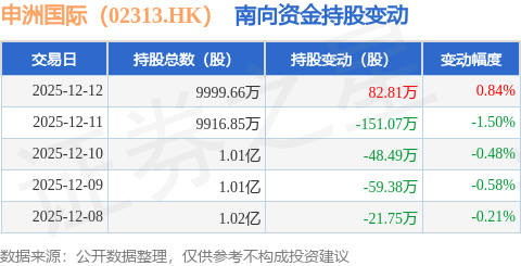 证券之星消息,12月12日南向资金增持82.81万股申洲国际(02313.HK)。近5个交易日中,获南向资金减持的有4天,累计净减持197.88万股。近20个交易日中,获南向资金增持的有12天,累计净增持10.17万股。截至目前,南向资金持有申洲国际(02313.HK)9999.66万股,占公司已发行普通股的6.64%。