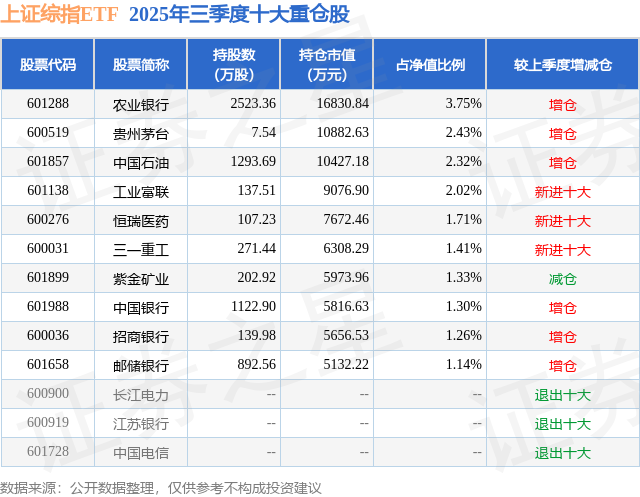 上证综指ETF基金成立于2011年1月30日,基金经理为王保合 方旻,基金跟踪标的为上证综合指数,成立以来超额回报为63.24%,近一个月超额回报为0.06%。最新披露的基金持仓数据显示,截止2025年9月30日,该基金第一大重仓股为农业银行(601288),持股占比为3.75%。