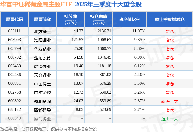 华富中证稀有金属主题ETF基金成立于2021年8月11日,基金经理为李孝华,基金跟踪标的为中证稀有金属主题指数,成立以来超额回报为0.9%,近一个月超额回报为0.18%。最新披露的基金持仓数据显示,截止2025年9月30日,该基金第一大重仓股为北方稀土(600111),持股占比为11.07%。