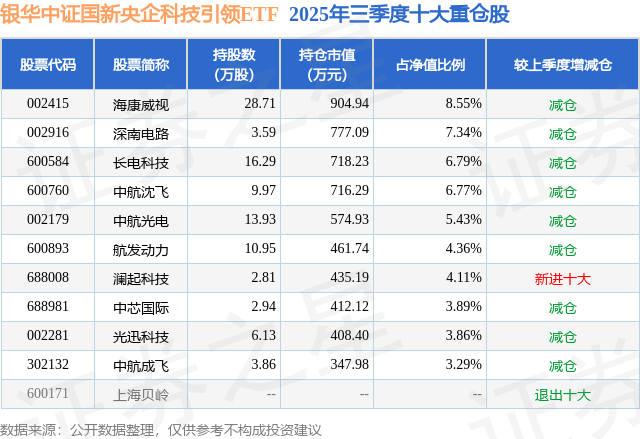 银华中证国新央企科技引领ETF基金成立于2023年6月26日,基金经理为王帅,基金跟踪标的为中证国新央企科技引领指数,成立以来超额回报为3.82%,近一个月超额回报为-0.03%。最新披露的基金持仓数据显示,截止2025年9月30日,该基金第一大重仓股为海康威视(002415),持股占比为8.55%。