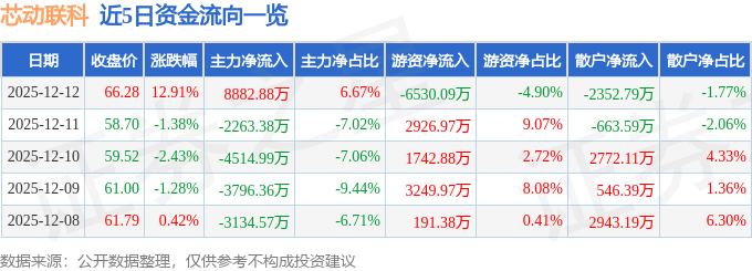 证券之星消息,截至2025年12月12日收盘,芯动联科(688582)报收于66.28元,上涨12.91%,换手率8.42%,成交量21.08万手,成交额13.33亿元。