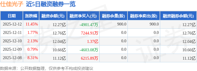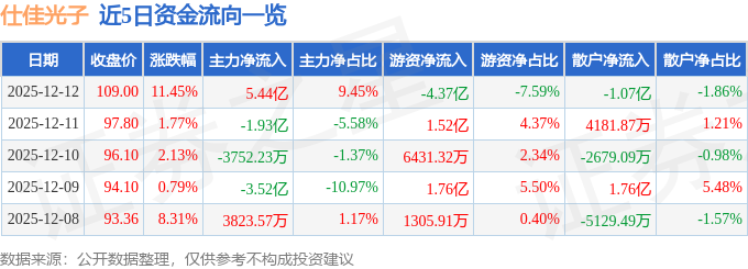 证券之星消息,截至2025年12月12日收盘,仕佳光子(688313)报收于109.0元,上涨11.45%,换手率12.24%,成交量56.16万手,成交额57.61亿元。