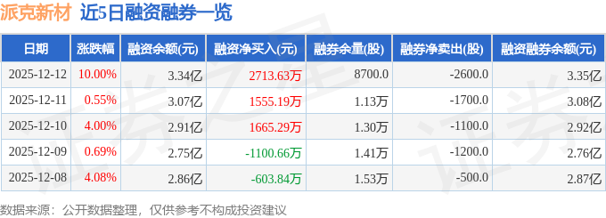 派克新材融资融券信息显示,融资方面,当日融资买入1.24亿元,融资偿还9697.12万元,融资净买入2713.63万元,连续3日净买入累计5934.11万元。融券方面,融券卖出1200.0股,融券偿还3800.0股,融券余量8700.0股,融券余额75.82万元。融资融券余额3.35亿元。