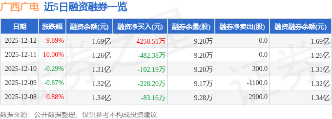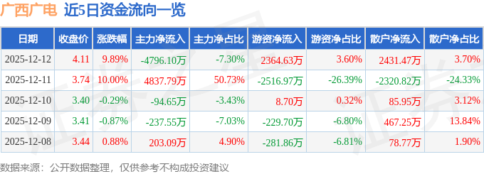 证券之星消息,截至2025年12月12日收盘,广西广电(600936)报收于4.11元,上涨9.89%,已连续涨停2天,换手率9.73%,成交量162.65万手,成交额6.57亿元。