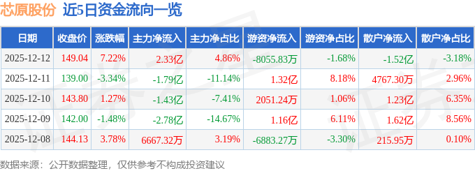 12月12日的资金流向数据方面,主力资金净流入2.33亿元,占总成交额4.86%,游资资金净流出8055.83万元,占总成交额1.68%,散户资金净流出1.52亿元,占总成交额3.18%。