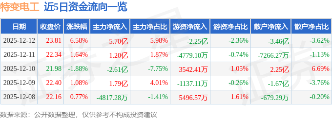 证券之星消息,截至2025年12月12日收盘,特变电工(600089)报收于23.81元,上涨6.58%,换手率8.08%,成交量408.27万手,成交额95.38亿元。