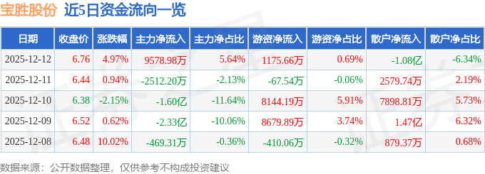 证券之星消息,截至2025年12月12日收盘,宝胜股份(600973)报收于6.76元,上涨4.97%,换手率18.65%,成交量255.76万手,成交额16.97亿元。