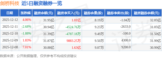 剑桥科技融资融券信息显示,融资方面,当日融资买入6.6亿元,融资偿还5.59亿元,融资净买入1.01亿元,净买入额两市排名第13。融券方面,融券卖出800.0股,融券偿还1.12万股,融券余量8.19万股,融券余额977.49万元。融资融券余额32.05亿元。