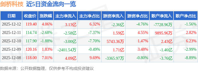12月12日的资金流向数据方面,主力资金净流入3.13亿元,占总成交额6.32%,游资资金净流出2.36亿元,占总成交额4.76%,散户资金净流出7728.96万元,占总成交额1.56%。