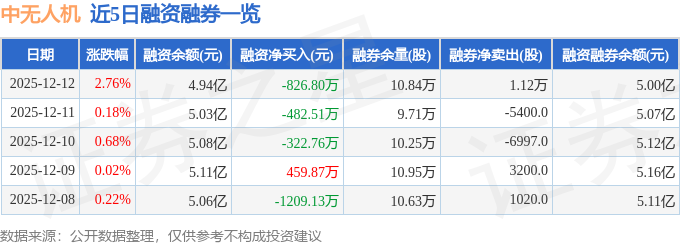 中无人机融资融券信息显示,融资方面,当日融资买入3745.58万元,融资偿还4572.38万元,融资净偿还826.8万元。融券方面,融券卖出1.4万股,融券偿还2728.0股,融券余量10.84万股,融券余额508.42万元。融资融券余额5.0亿元。