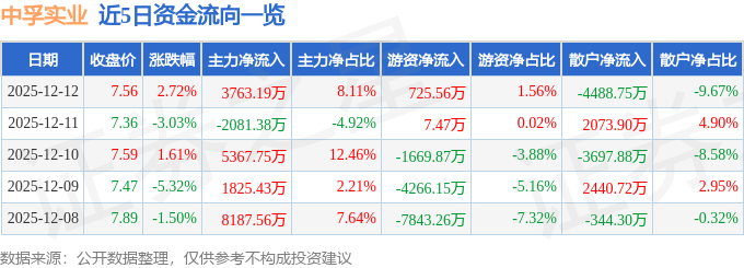 证券之星消息,截至2025年12月12日收盘,中孚实业(600595)报收于7.56元,上涨2.72%,换手率1.53%,成交量61.49万手,成交额4.64亿元。