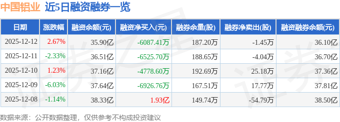中国铝业融资融券信息显示,融资方面,当日融资买入2.18亿元,融资偿还2.79亿元,融资净偿还6087.41万元。融券方面,融券卖出10.47万股,融券偿还11.92万股,融券余量187.2万股,融券余额2012.4万元。融资融券余额36.1亿元。