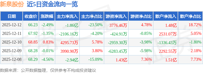 证券之星消息,截至2025年12月12日收盘,新泉股份(603179)报收于66.23元,下跌2.49%,换手率2.34%,成交量11.96万手,成交额7.9亿元。