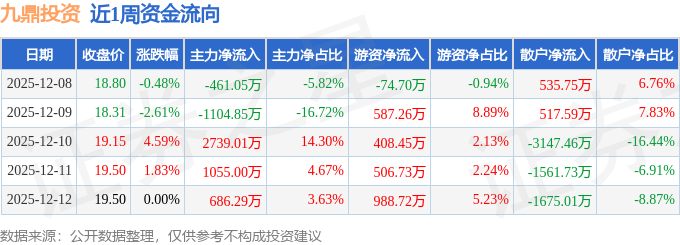 资金流向数据方面,本周九鼎投资主力资金合计净流入2914.39万元,游资资金合计净流入2416.47万元,散户资金合计净流出5330.86万元。本周资金流向一览见下表: