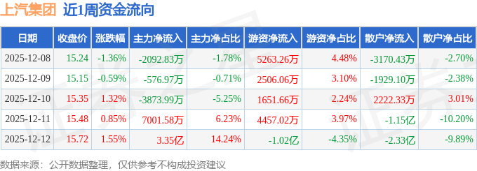 资金流向数据方面,本周上汽集团主力资金合计净流入3.39亿元,游资资金合计净流入3644.13万元,散户资金合计净流出3.76亿元。本周资金流向一览见下表: