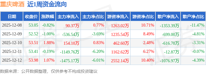 沪深股通持股方面,截止2025年12月12日收盘,重庆啤酒沪股通持股数为3015.31万股,占流通股比为623.0%。