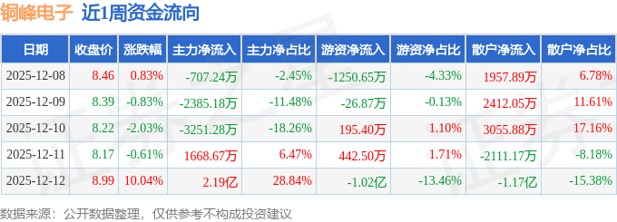 资金流向数据方面,本周铜峰电子主力资金合计净流入1.73亿元,游资资金合计净流出1.09亿元,散户资金合计净流出6384.98万元。本周资金流向一览见下表: