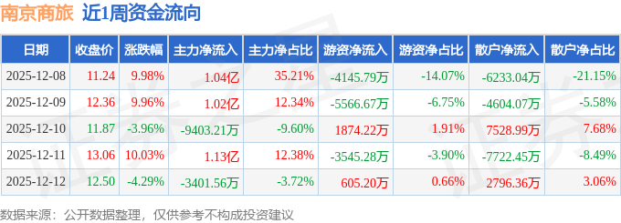 资金流向数据方面,本周南京商旅主力资金合计净流入1.9亿元,游资资金合计净流出1.08亿元,散户资金合计净流出8234.21万元。本周资金流向一览见下表:
