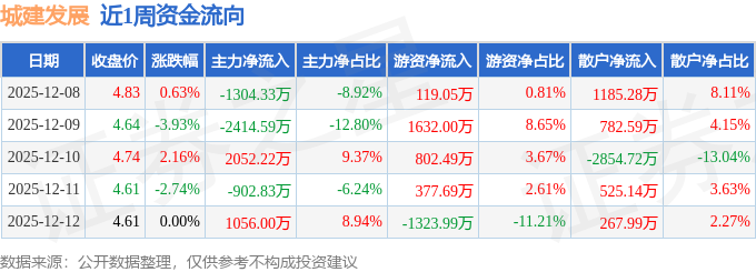 资金流向数据方面,本周城建发展主力资金合计净流出1513.53万元,游资资金合计净流入1607.24万元,散户资金合计净流出93.71万元。本周资金流向一览见下表: