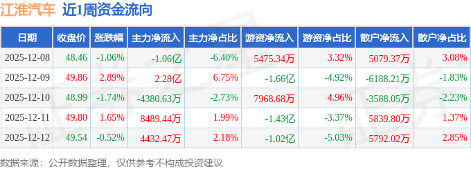 沪深股通持股方面,截止2025年12月12日收盘,江淮汽车沪股通持股数为7601.9万股,占流通股比为348.0%。