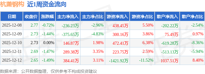 资金流向数据方面,本周杭萧钢构主力资金合计净流入208.77万元,游资资金合计净流入12.86万元,散户资金合计净流出221.63万元。本周资金流向一览见下表: