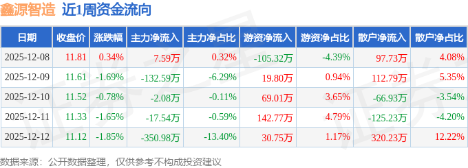 资金流向数据方面,本周鑫源智造主力资金合计净流出495.59万元,游资资金合计净流入157.01万元,散户资金合计净流入338.59万元。本周资金流向一览见下表: