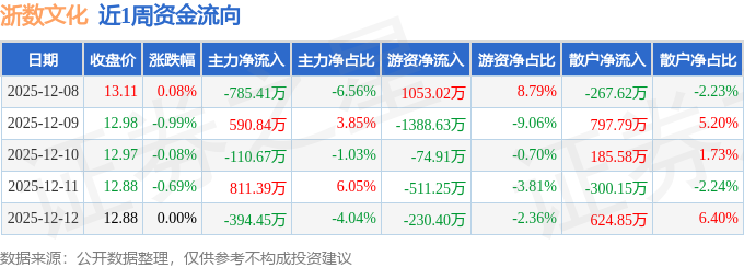 资金流向数据方面,本周浙数文化主力资金合计净流入111.71万元,游资资金合计净流出1152.16万元,散户资金合计净流入1040.45万元。本周资金流向一览见下表: