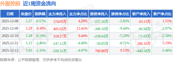 资金流向数据方面,本周外服控股主力资金合计净流入313.91万元,游资资金合计净流出54.06万元,散户资金合计净流出259.85万元。本周资金流向一览见下表: