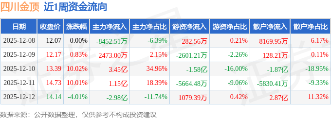 资金流向数据方面,本周四川金顶主力资金合计净流入1.02亿元,游资资金合计净流出2.27亿元,散户资金合计净流入1.25亿元。本周资金流向一览见下表: