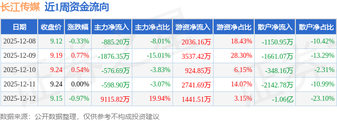 资金流向数据方面,本周长江传媒主力资金合计净流入5178.67万元,游资资金合计净流入1.07亿元,散户资金合计净流出1.59亿元。本周资金流向一览见下表: