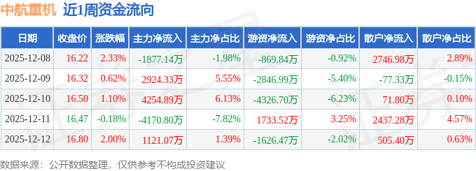 资金流向数据方面,本周中航重机主力资金合计净流入2252.35万元,游资资金合计净流出7936.48万元,散户资金合计净流入5684.13万元。本周资金流向一览见下表: