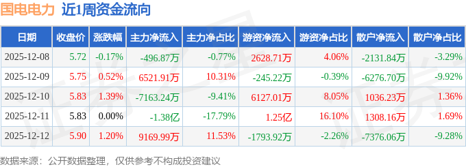 资金流向数据方面,本周国电电力主力资金合计净流出5759.63万元,游资资金合计净流入1.92亿元,散户资金合计净流出1.34亿元。本周资金流向一览见下表: