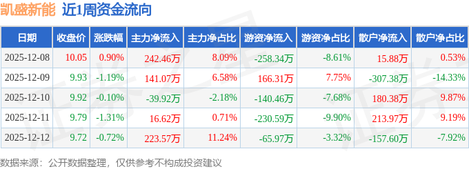 资金流向数据方面,本周凯盛新能主力资金合计净流入583.8万元,游资资金合计净流出529.05万元,散户资金合计净流出54.75万元。本周资金流向一览见下表: