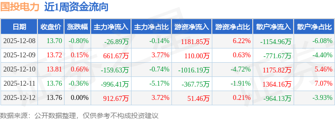 资金流向数据方面,本周国投电力主力资金合计净流入391.41万元,游资资金合计净流出40.63万元,散户资金合计净流出350.77万元。本周资金流向一览见下表: