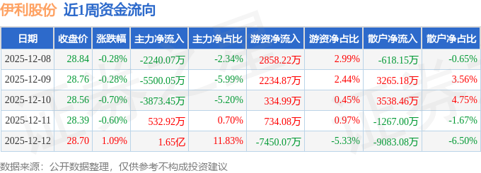 资金流向数据方面,本周伊利股份主力资金合计净流入5452.49万元,游资资金合计净流出1287.9万元,散户资金合计净流出4164.59万元。本周资金流向一览见下表: