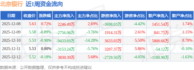 证券之星消息,截至2025年12月12日收盘,北京银行(601169)报收于5.52元,较上周的5.59元下跌1.25%。本周,北京银行12月8日盘中最高价报5.65元。12月12日盘中最低价报5.5元。北京银行当前最新总市值1167.09亿元,在城商行板块市值排名5/17,在两市A股市值排名145/5170。